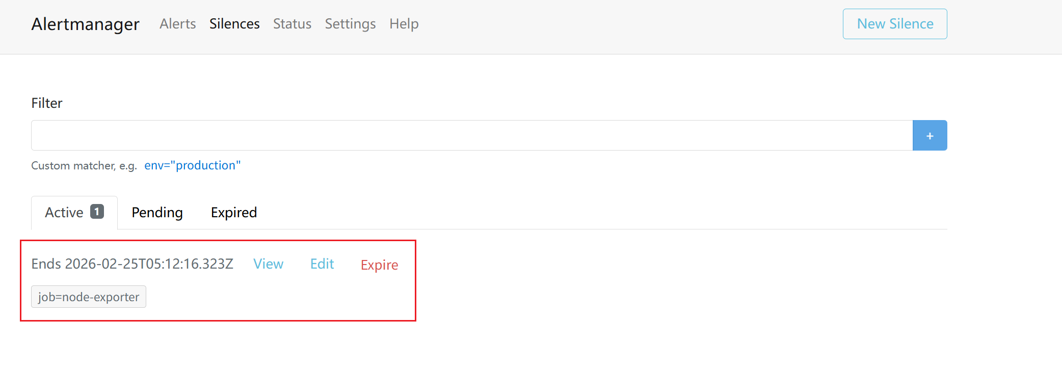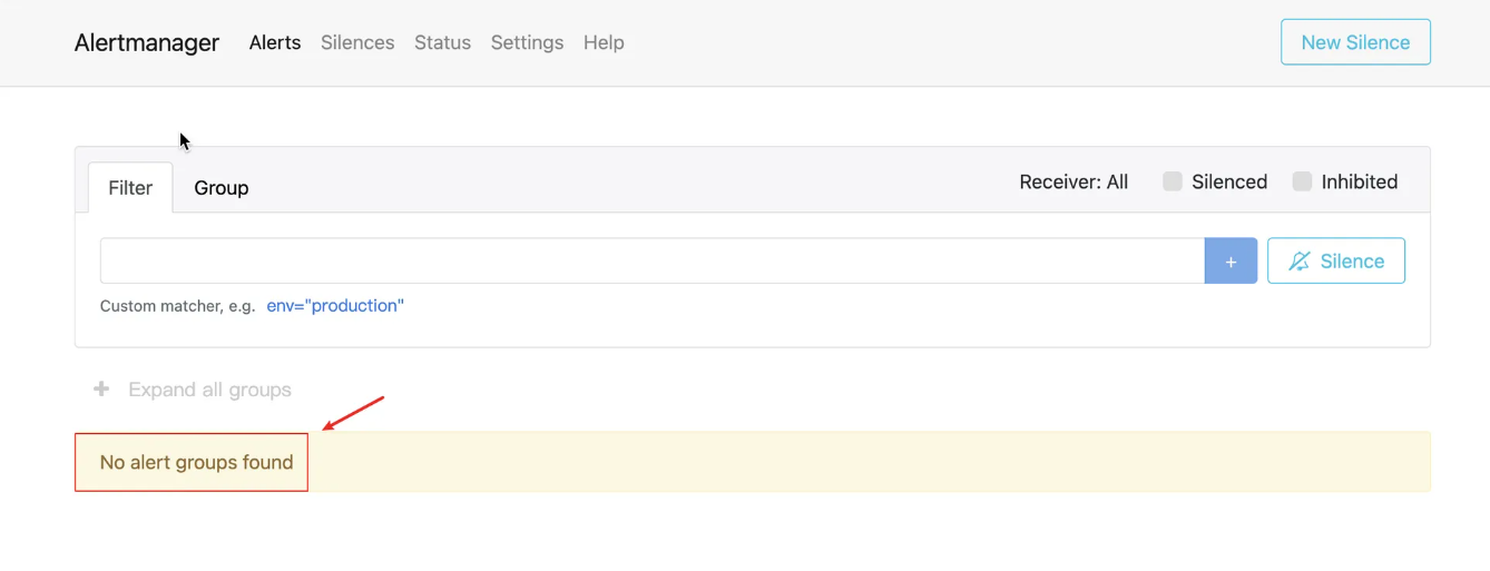 当静默规则生效以后,从Alertmanager的Alerts页面下用户将不会看到该规则匹配到的告警信息。