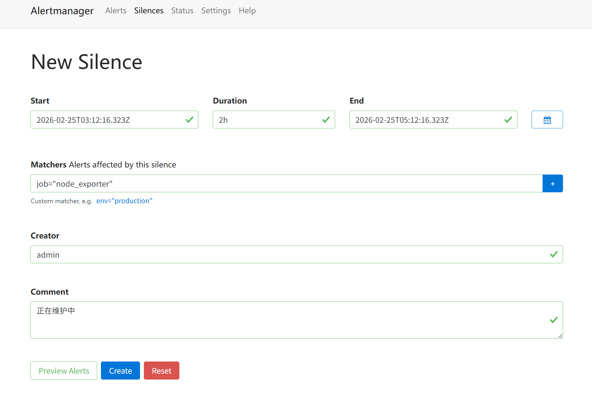 定义静默规则的开始时间以及持续时间和结束时间,通过Matchers部分可以设置多条匹配规则(字符串匹配或者正则匹配)。填写当前静默规则的创建者以及创建原因后,点击"Create"按钮即可。