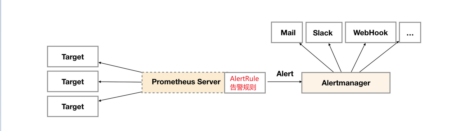 告警能力在Prometheus的架构中被划分成两个独立的部分。如下所示,通过在Prometheus中定义AlertRule(告警规则),Prometheus会周期性的对告警规则进行计算,如果满足告警触发条件就会向Alertmanager发送告警信息。