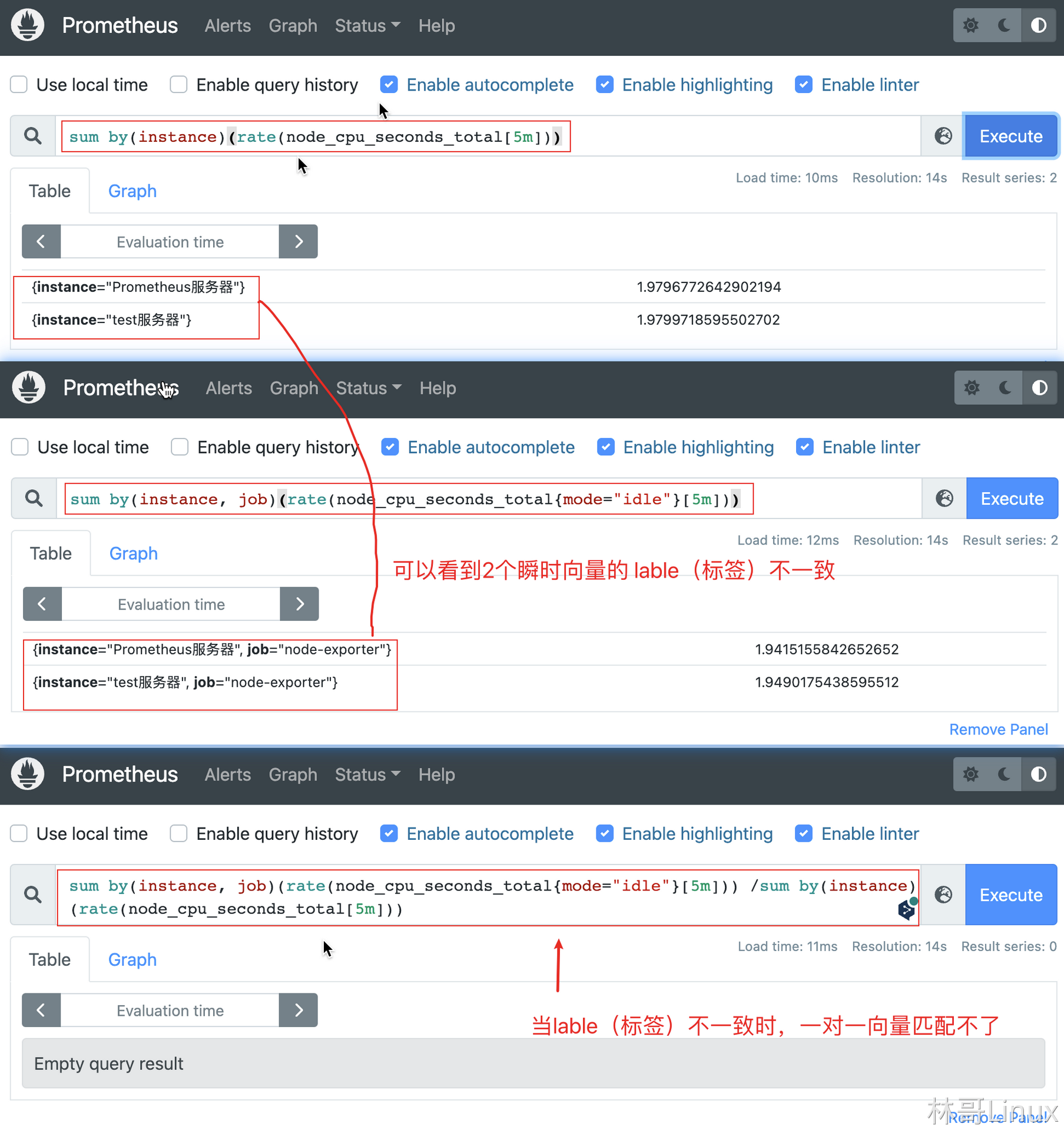 sum by(instance, job)(rate(node_cpu_seconds_total{mode="idle"}[5m])) / on(instance) sum by(instance)(rate(node_cpu_seconds_total[5m]))结果
