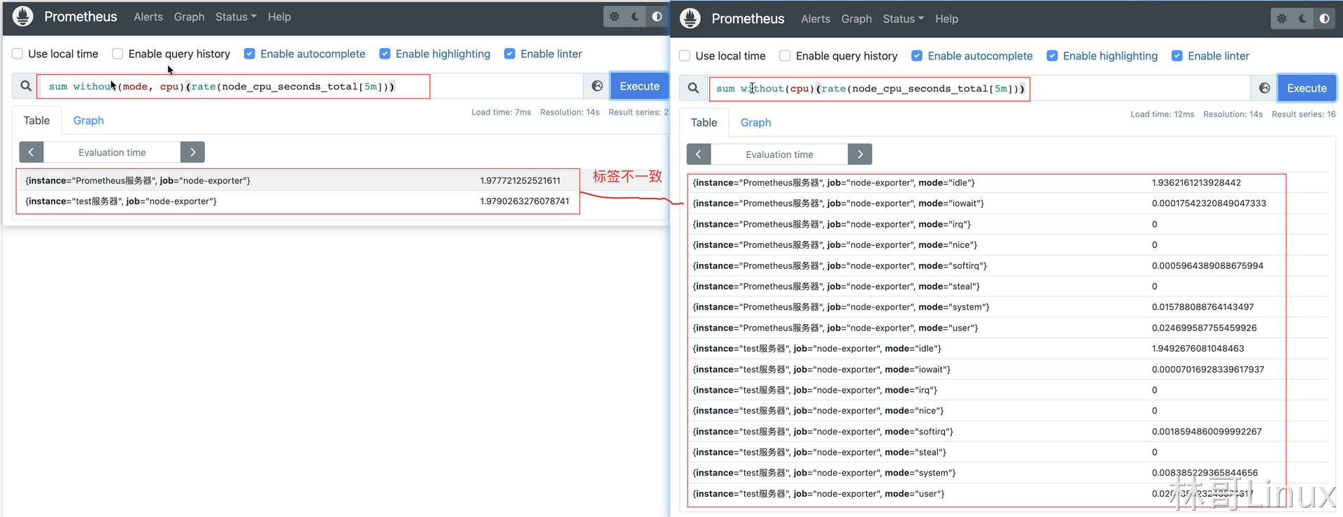 {instance="test服务器", job="node-exporter", mode="user"} 0.010064676176131668左右两边的瞬时向量标签不一致: