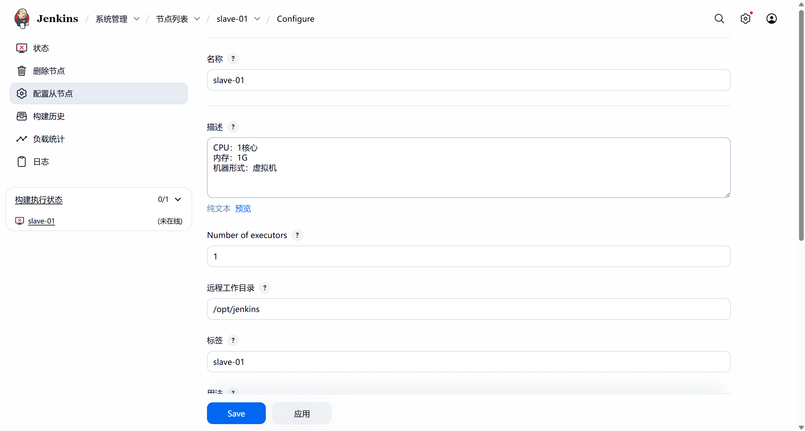 添加完毕后,在Jenkins主界面,可以看到新添加的Slave Node,但是红叉表示此时的Slave并未与Master建立起联系。
