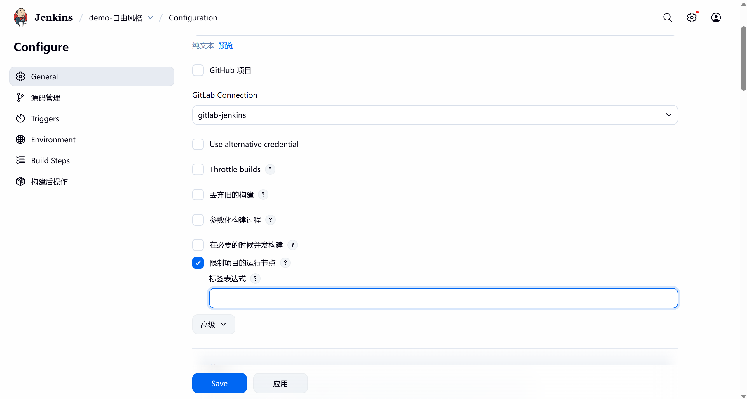 创建Job的页面,“General”下勾选“Restric where this project can be run”,填写Label Expression。