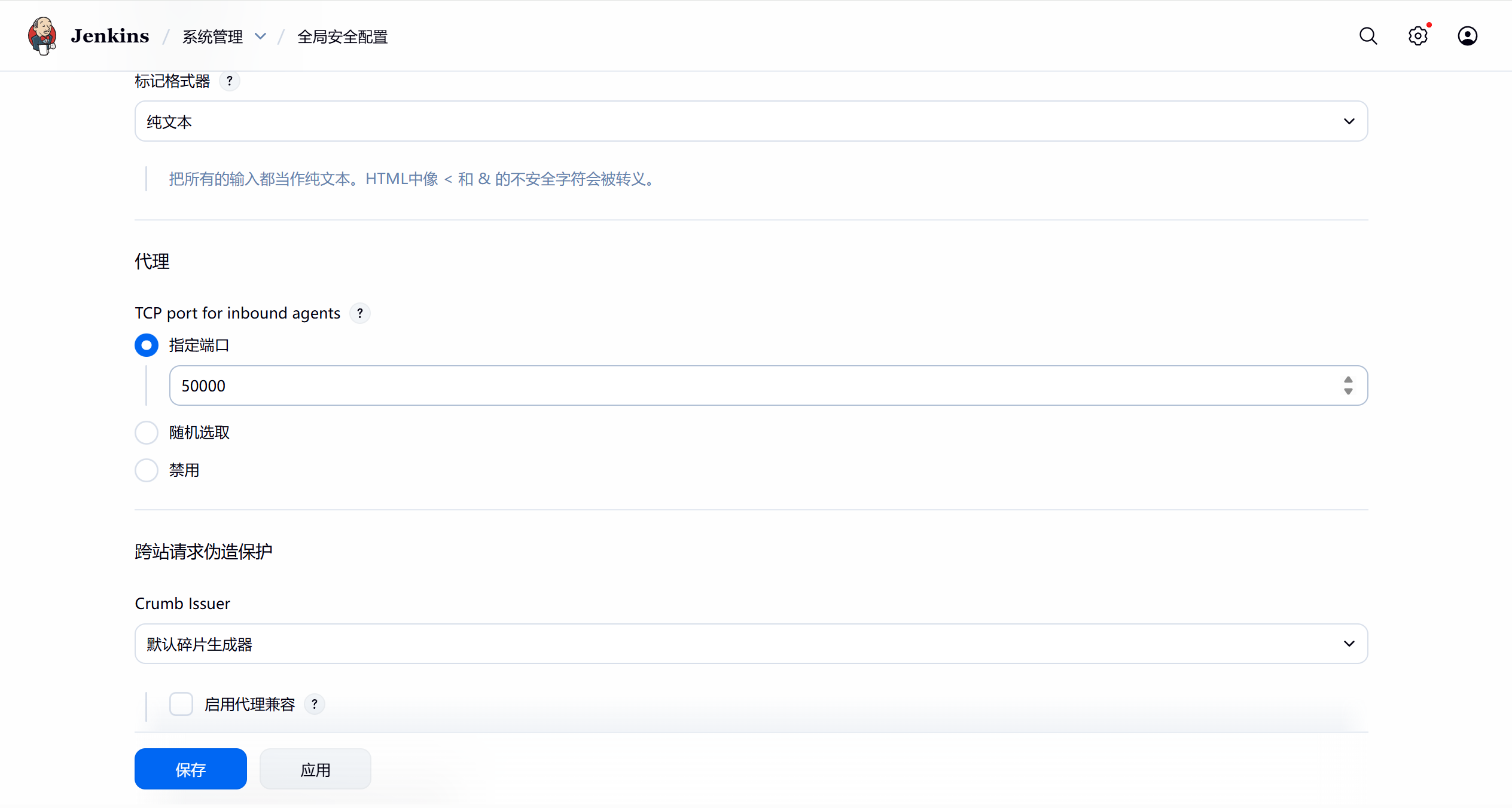 jenkins web代理的tcp端口不是通过命令启动的而是通过在全局安全设置中配置的,配置成功后会在系统上运行一个指定的端口